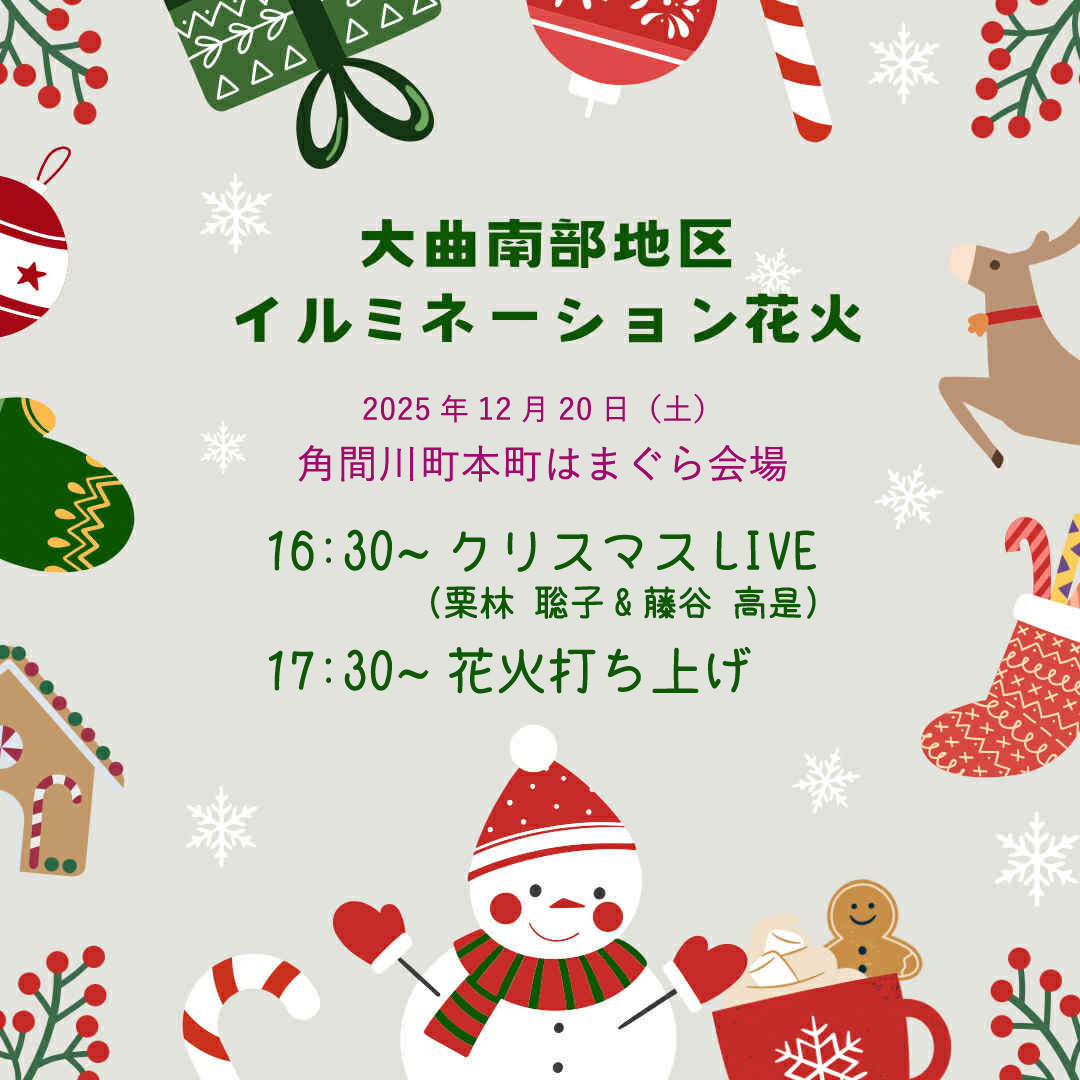 藤谷さん扇田さんとのトリオでお送りします。ご存じのとおり、角間川地区はこの時期それぞれのご家庭で、お店で、町をあげてのイルミネーションがきらきらと煌めきはじめます。仕事帰りに毎日見れる私の幸せたるや…
